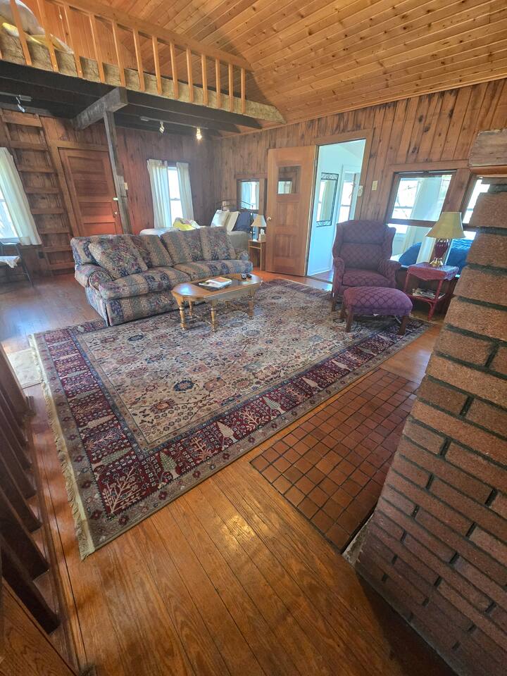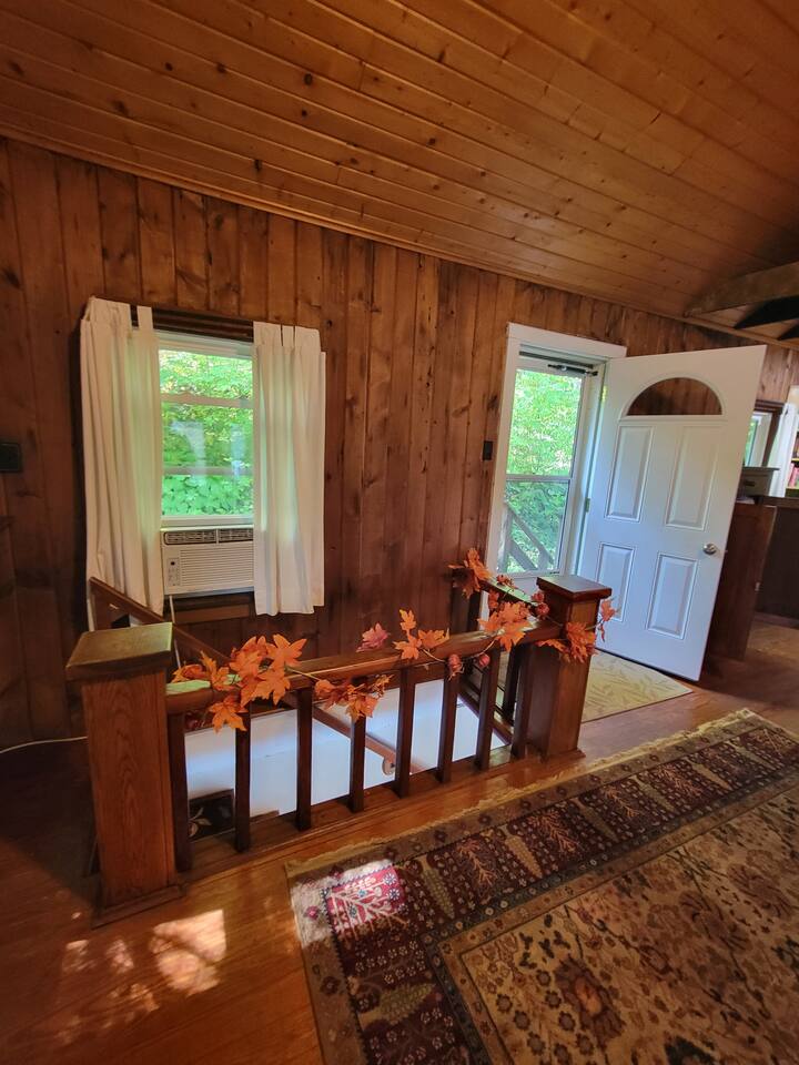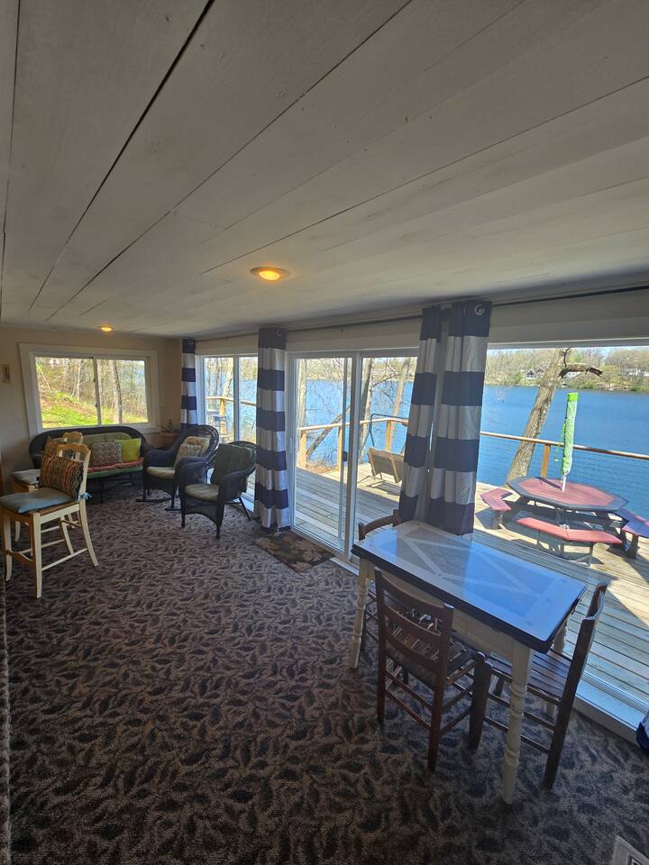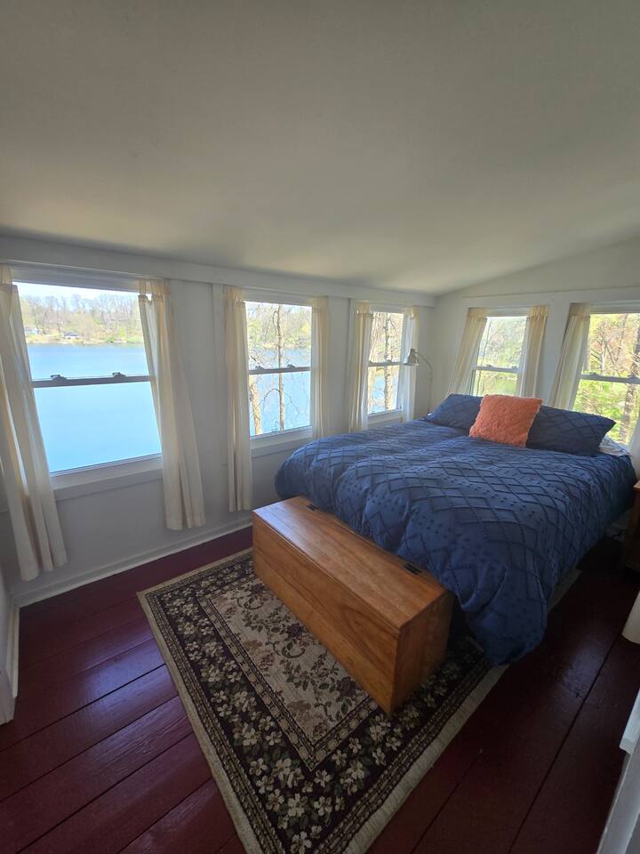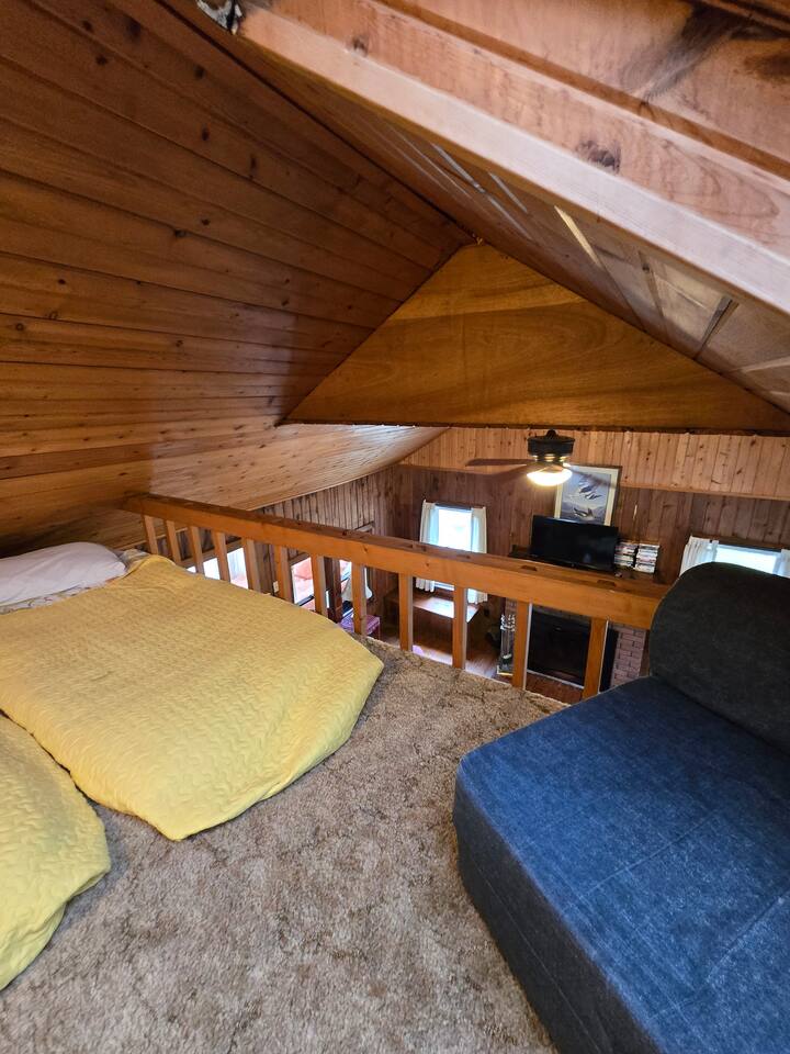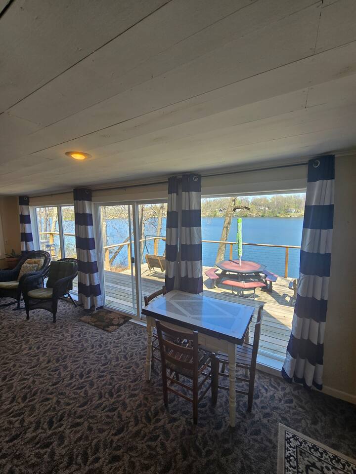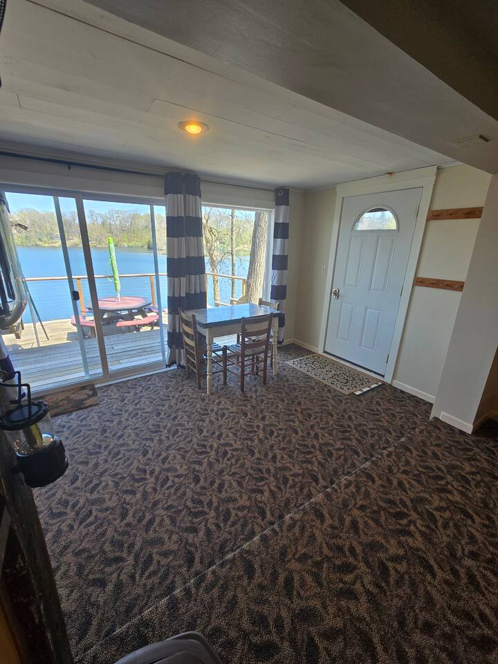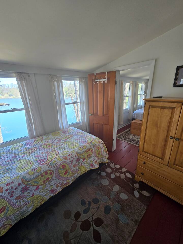 The kitchen, dining, bath and laundry areas are on the lower level with sliding glass doors all along the front to take in beautiful sunsets. At the top of the stairs, you will find the living room with fireplace, games and there is a full sized bed placed in the back corner. Off of the living room are 2 bedrooms. You have to go through the bedroom with a queen bed to get to the other bedroom with a twin. We have a peddle boat, row boat, kayaks and a swim raft that you are more than welcome to use. There is room to park one vehicle at the bottom of our shared drive. Please do not block the drive as this is the same way the neighbors exit.