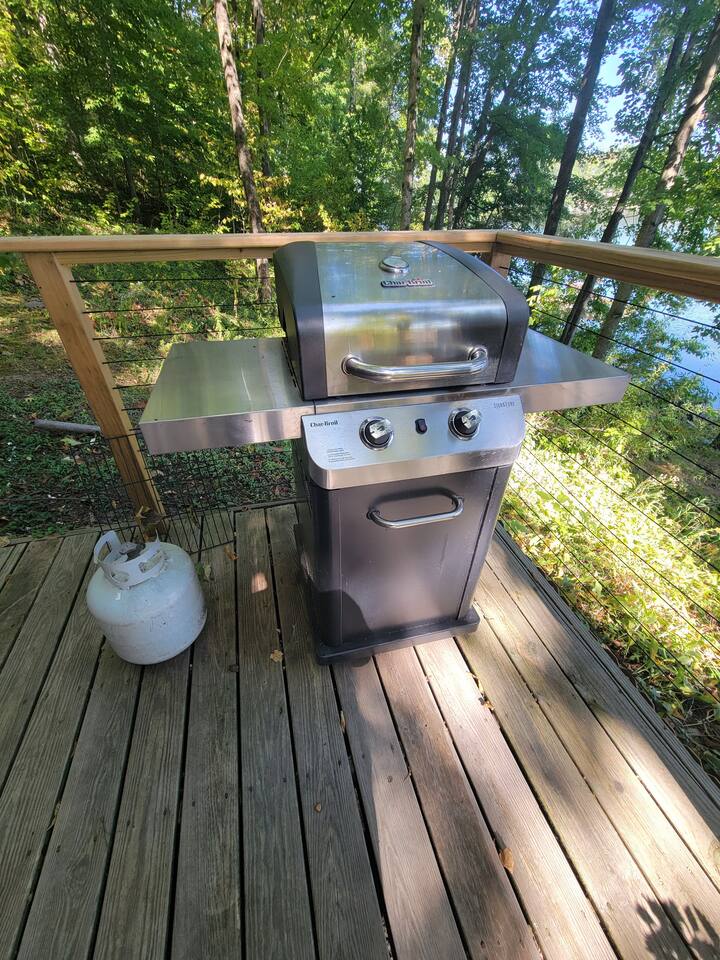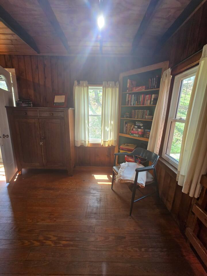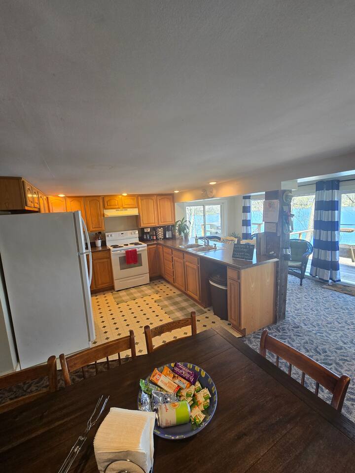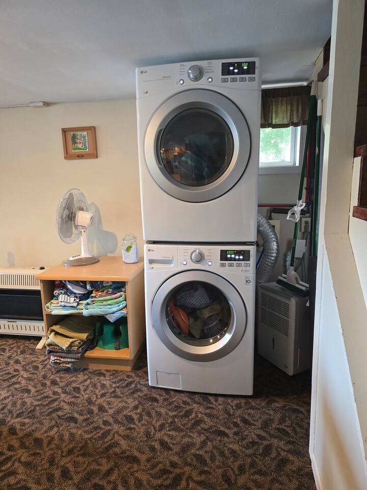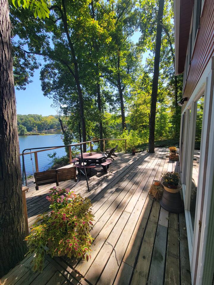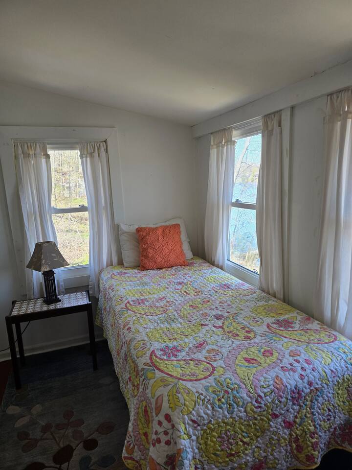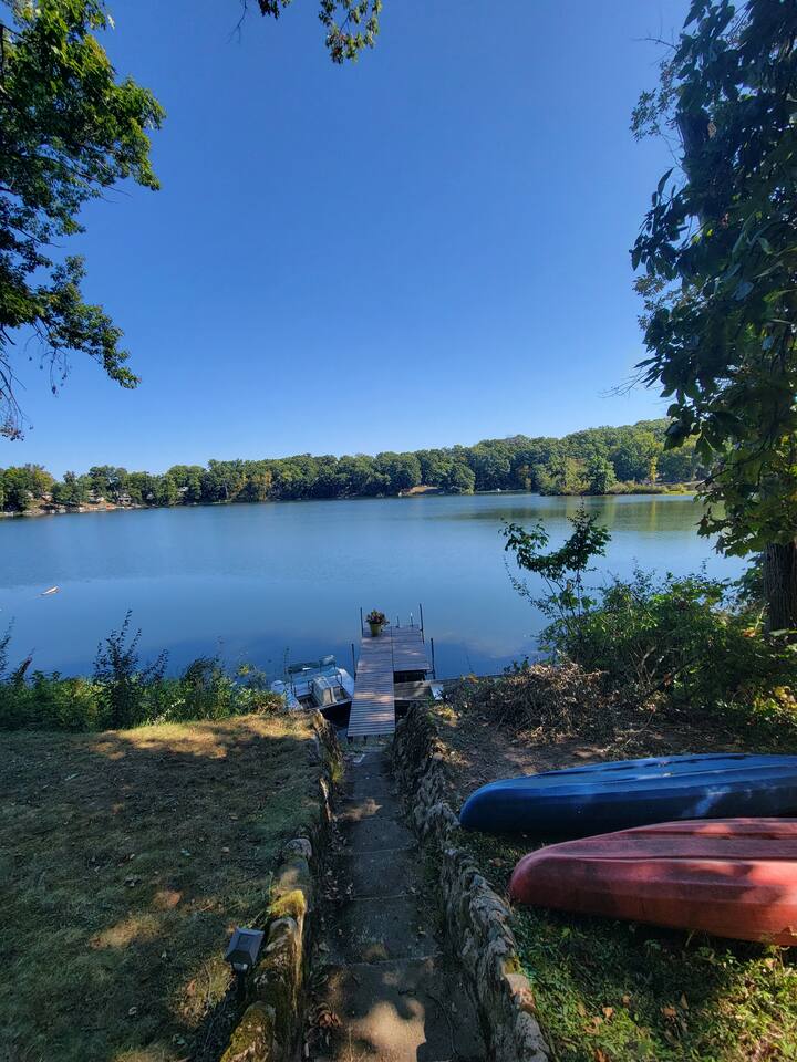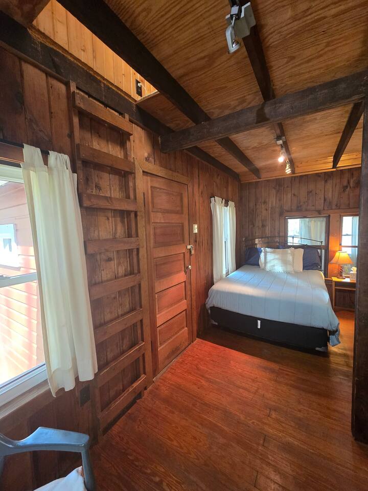 The kitchen, dining, bath and laundry areas are on the lower level with sliding glass doors all along the front to take in beautiful sunsets. At the top of the stairs, you will find the living room with fireplace, games and there is a full sized bed placed in the back corner. Off of the living room are 2 bedrooms. You have to go through the bedroom with a queen bed to get to the other bedroom with a twin. We have a peddle boat, row boat, kayaks and a swim raft that you are more than welcome to use. There is room to park one vehicle at the bottom of our shared drive. Please do not block the drive as this is the same way the neighbors exit.