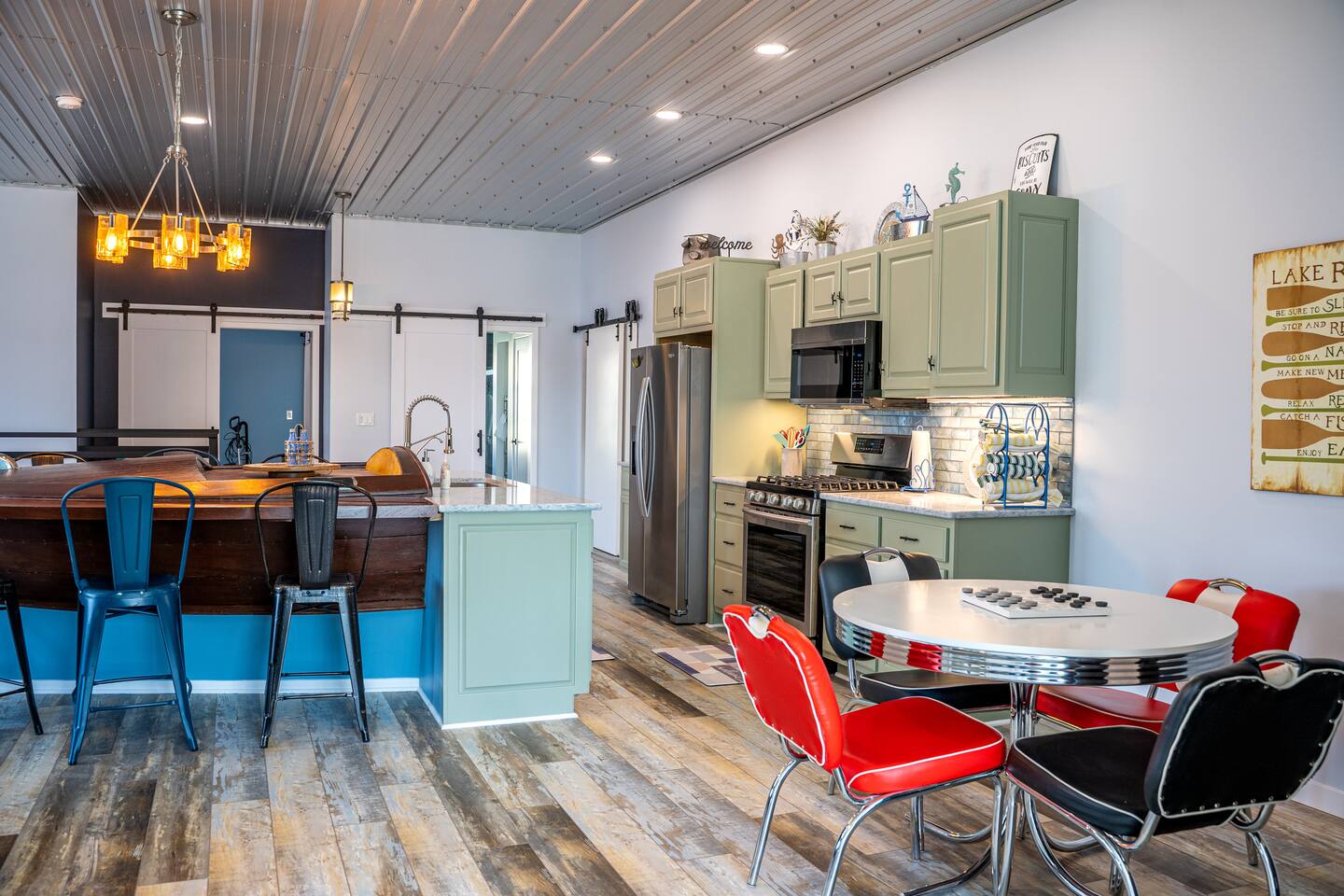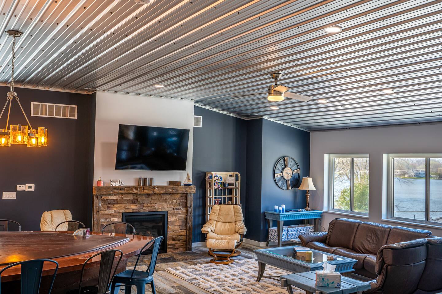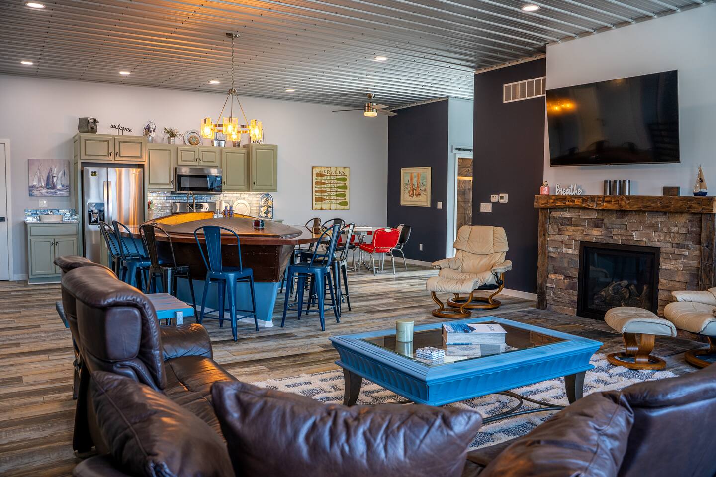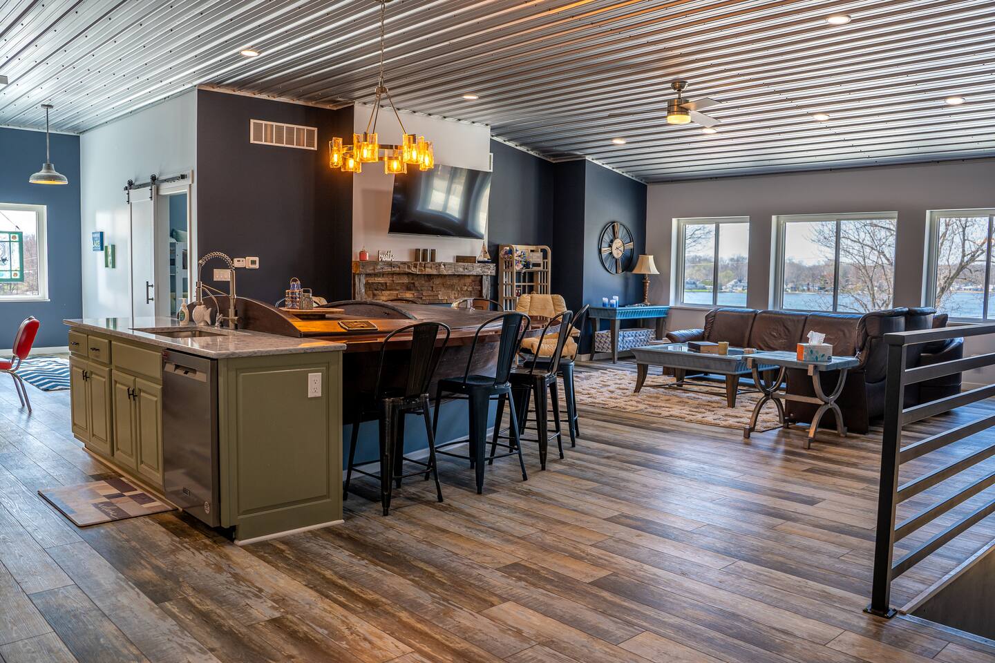 The building is on a main road of Lake Tippecanoe. It resembles and old-time barn complete with a copper roof, green siding, and red doors. The Wave, as I affectionally refer to it is in the top half and occupies about 2500 feet. It is spacious! There is plenty of parking and space for your boat trailer if you bring your own. Just a short distance from the historical Tippy Dance Hall which can serve (for a small fee) as a boat launch. Just a stone throw away is T24 and the lake front home of the hostess. Guest may use the pier space for lake access and swimming at leisure. Pier space is available at an additional cost.