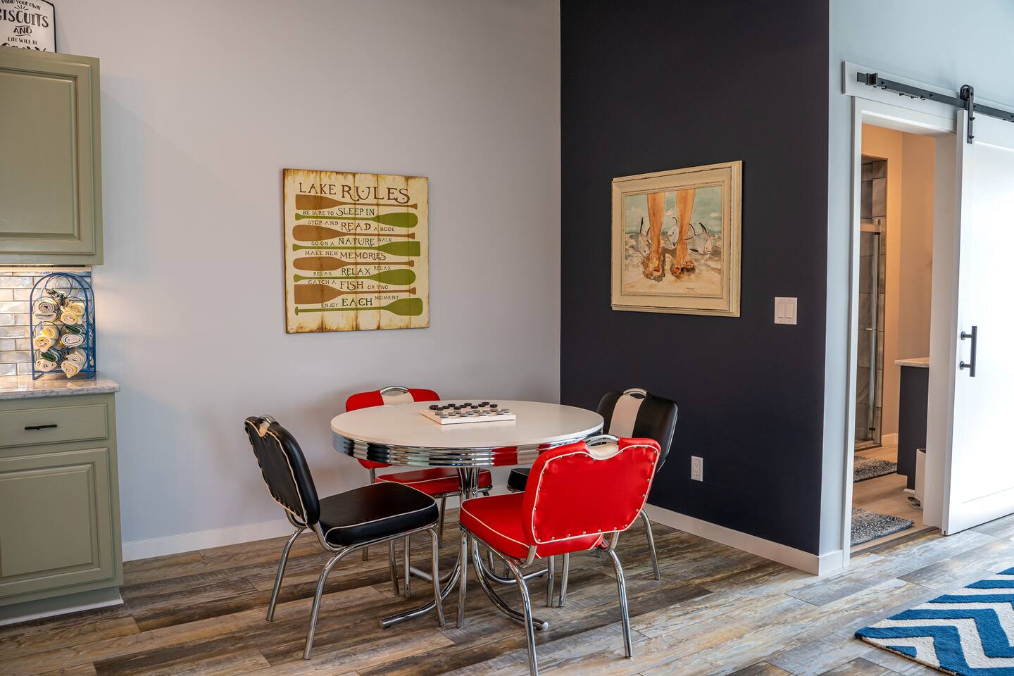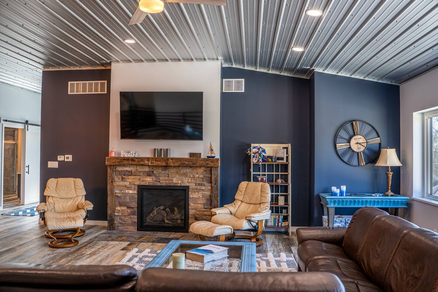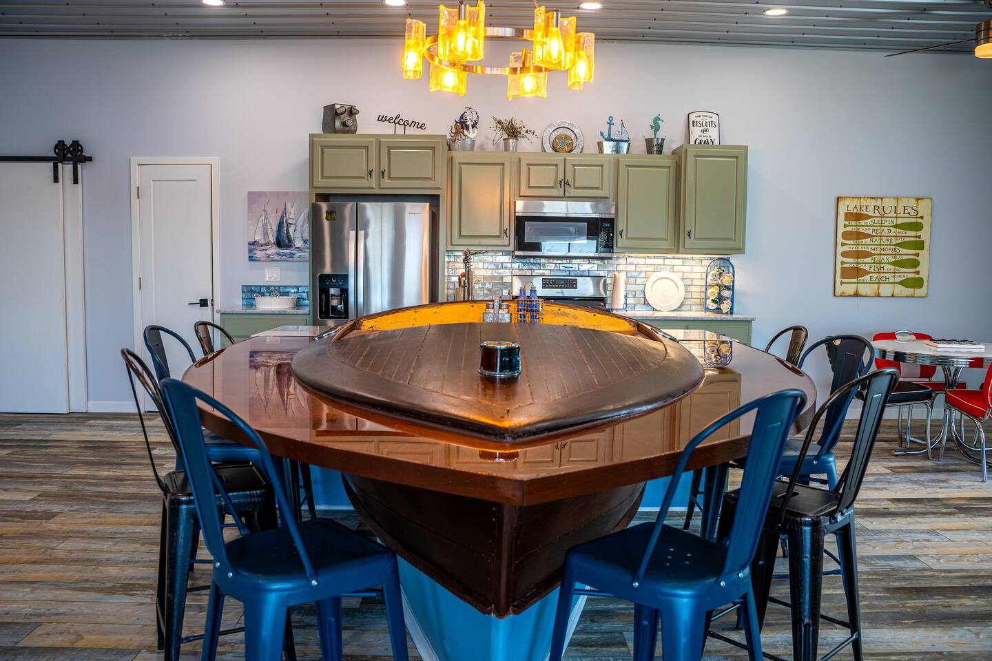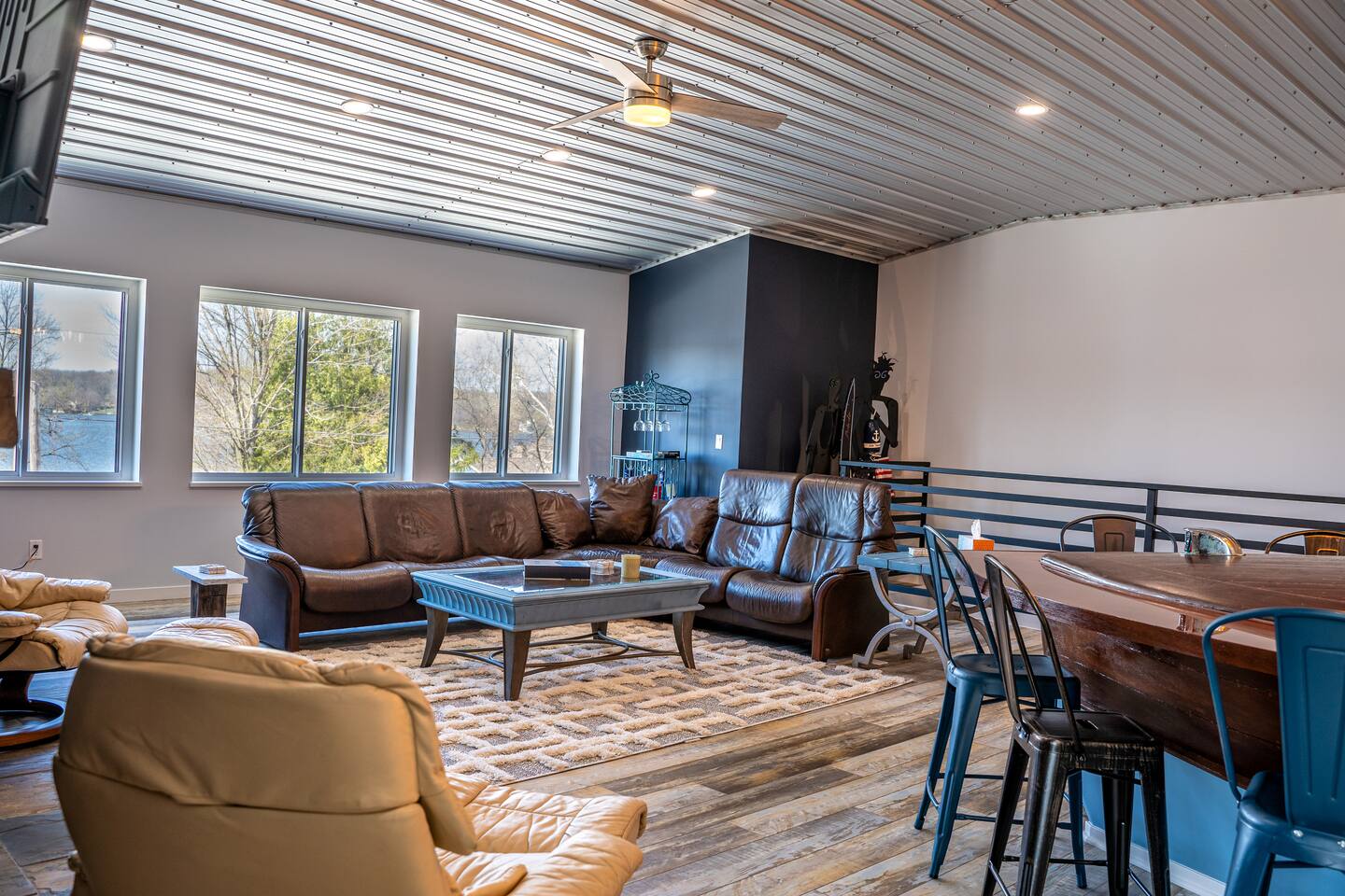 The building is on a main road of Lake Tippecanoe. It resembles and old-time barn complete with a copper roof, green siding, and red doors. The Wave, as I affectionally refer to it is in the top half and occupies about 2500 feet. It is spacious! There is plenty of parking and space for your boat trailer if you bring your own. Just a short distance from the historical Tippy Dance Hall which can serve (for a small fee) as a boat launch. Just a stone throw away is T24 and the lake front home of the hostess. Guest may use the pier space for lake access and swimming at leisure. Pier space is available at an additional cost.
